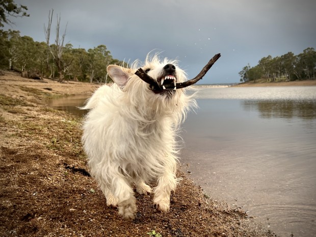 Ever ready Teddy gets his stick as the storm rolls in