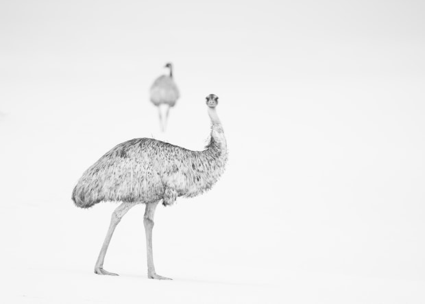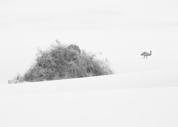 A mob of feather and legs wanders through the sand dunes of Mungo National Park, their profiles temporarily stamped into a background of drifting sand.