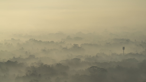The mist of dawn and smoke of Mount Merapi–a nearby volcano–combine to blur the boundaries between what is intrinsic to the Borobudur landscape, and what is not.