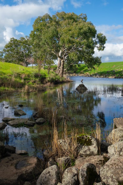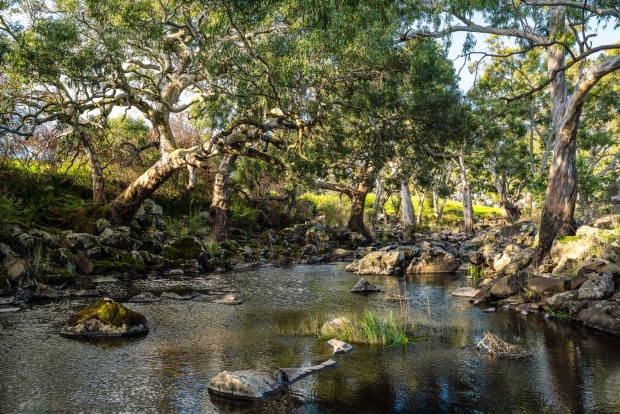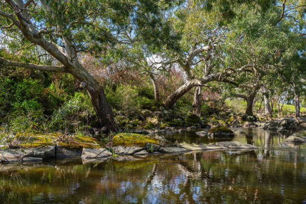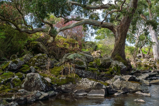 Along this peaceful creek, moss-covered rocks and weathered gums tell the story of time and resilience. The gentle reflections and soft light reveal the quiet harmony that exists between water, stone, and tree.