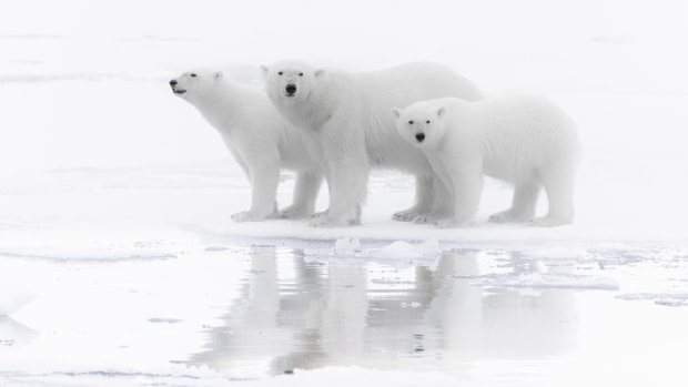 A family of polar bear reflects on the still ocean and blends into their foggy background