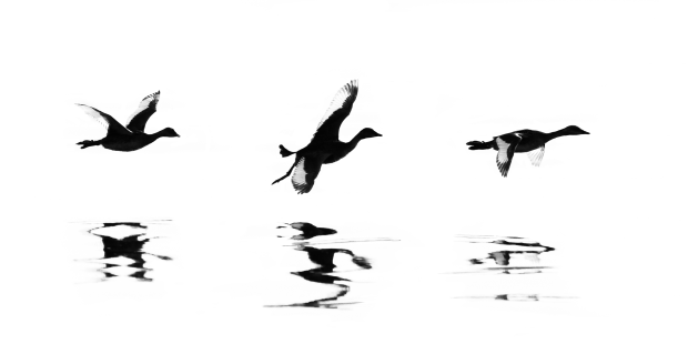 Three Grebes in synchronised flight are silhouetted against the morning light. The beauty of their wings highlighted by the translucent feather edges. This image captures the essence of flight.