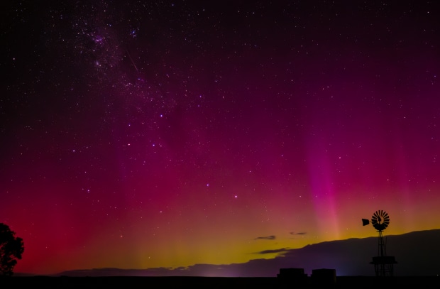 Arora Australis above a windmill pump and two water tanks