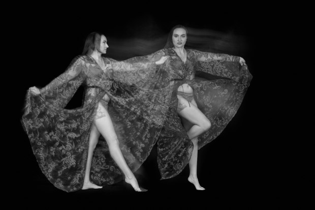 Long exposure + multiple flashes achieve these images of a woman emerging from the dark background three times